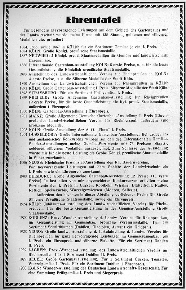 Im Jahr 1928 wird er im Adressbuch der Stadt Brühl als Händler genannt. Bis 1967 betrieb er im Brühler Stadtteil Heide - in der Villestraße 39 - eine Samenhandlung sowie ein Kolonialwarengeschäft mit den Schwerpunkten Obst, Gemüse und Blumen.